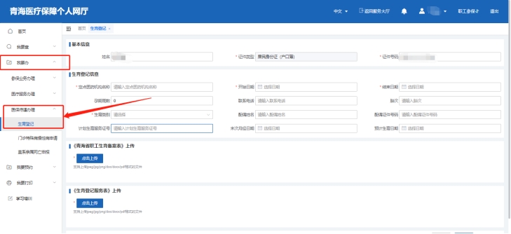 登录“个人网厅”→点击我要办→医保待遇办理→生育登记,参保人可通过该功能为自己进行生育备案登记。