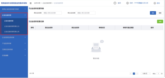 点击左侧菜单列表上选择【企业名称变更】进入企业名称变更菜单栏,点击菜单【企业名称变更】进入企业名称变更列表(如图4),点击“新增”按钮进行企业名称变更申请操作,在当前弹窗页面填写变更后企业名称及上传证明文件,确认无误后进行提交即可(如图5),后续等待管理端进行审核即可,如审核不通过在菜单操作项中点击编辑进行修改后重新提交(如图6),等待审核即可。审核通过后会进行公示、公布,企业可关注【企业名称变更信息公示】【企业名称变更信息公布】(如图7)