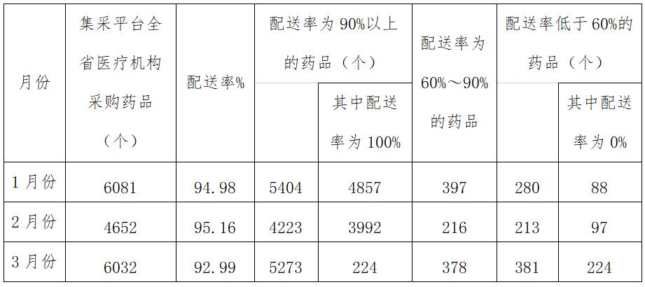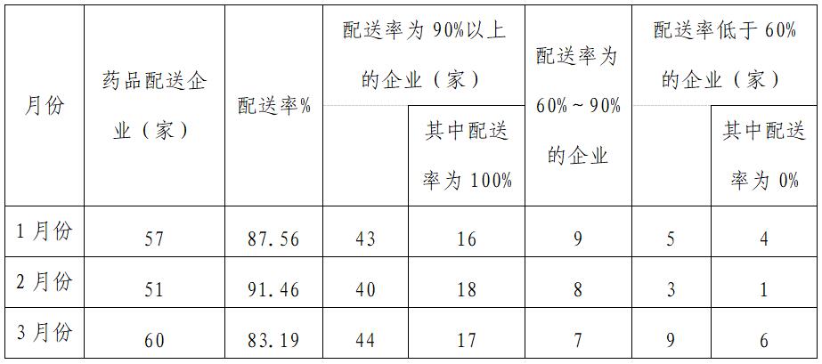为进一步压实集采(挂网)药品生产企业供应保障的主体责任,确保医疗机构临床使用需求,督促配送企业及时响应医疗机构采购订单,提高配送时效,及时处理医疗机构反映的供应配送问题,对无法及时满足医疗机构采购需求、不按协议供应的医药企业,依据相关管理规定给予相应信用评价,现就关于全省第一季度药品配送情况进行通报如下。